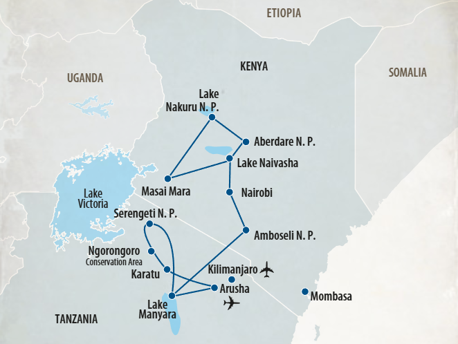 Nairobi, Aberdare N.P., Lake Nakuru N.P., Masai Mara N.P, Lake Naivasha, Amboseli N.P., Lake Manyara N.P., Serengeti N.P., Ngorongoro Conservation Area, Arusha/Kilimanjaro